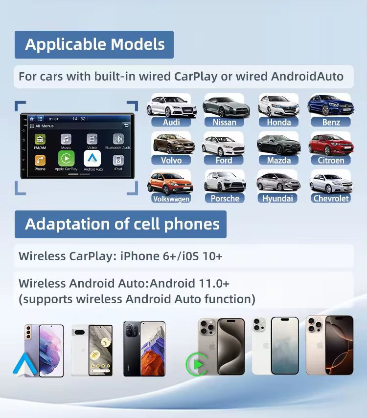 【Car and Phone Compatibility】Please make sure your car is equipped with factory wired carplay or wired Android Auto (2016 or above models). Support iPhone iOS10 or Android Auto 11.0 or later. The device supports more than 98% of the car models Note: for BMW, for Tesla, for Mitsubishi models are not supported!